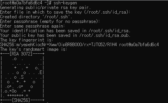 - 아무 값도 입력하지 않고 엔터를 누르면 /root/.ssh Directory 아래에다 저장함